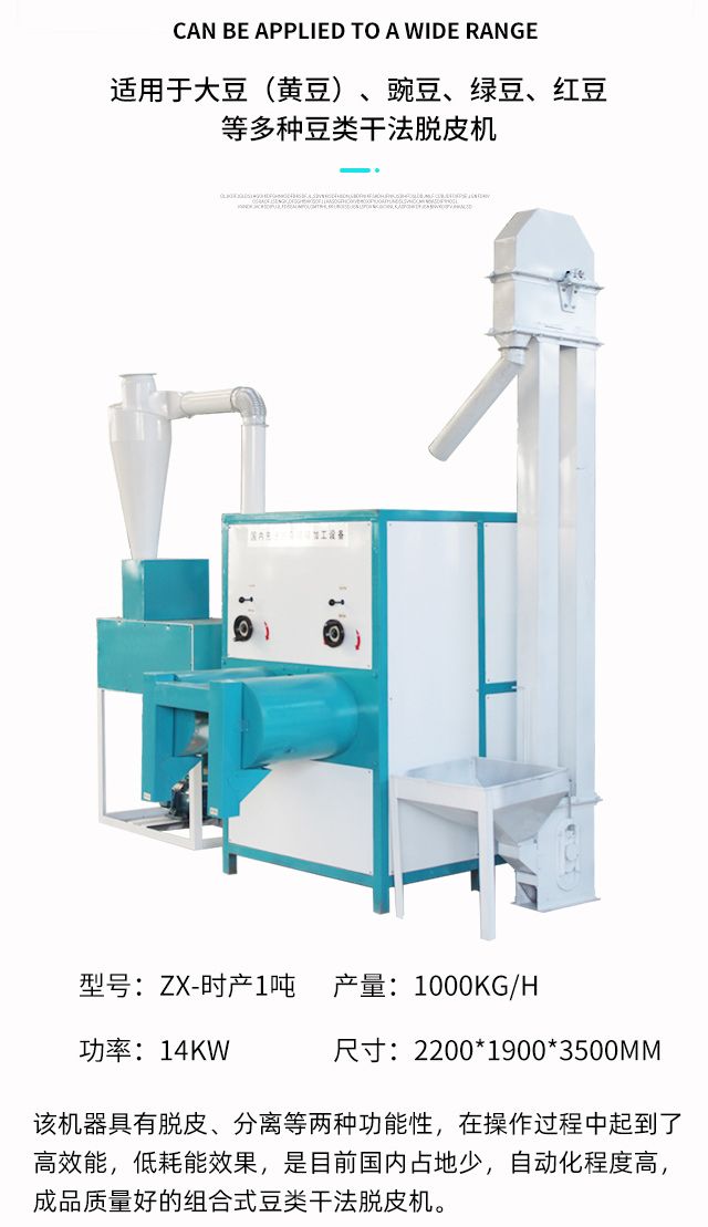 時(shí)產(chǎn)1噸全自動(dòng)大豆脫皮分瓣機(jī)適用于大豆(黃豆)、豌豆、綠豆、紅豆等多種豆類干法脫皮機(jī),也可被稱為全自動(dòng)大豆脫皮打瓣機(jī)。